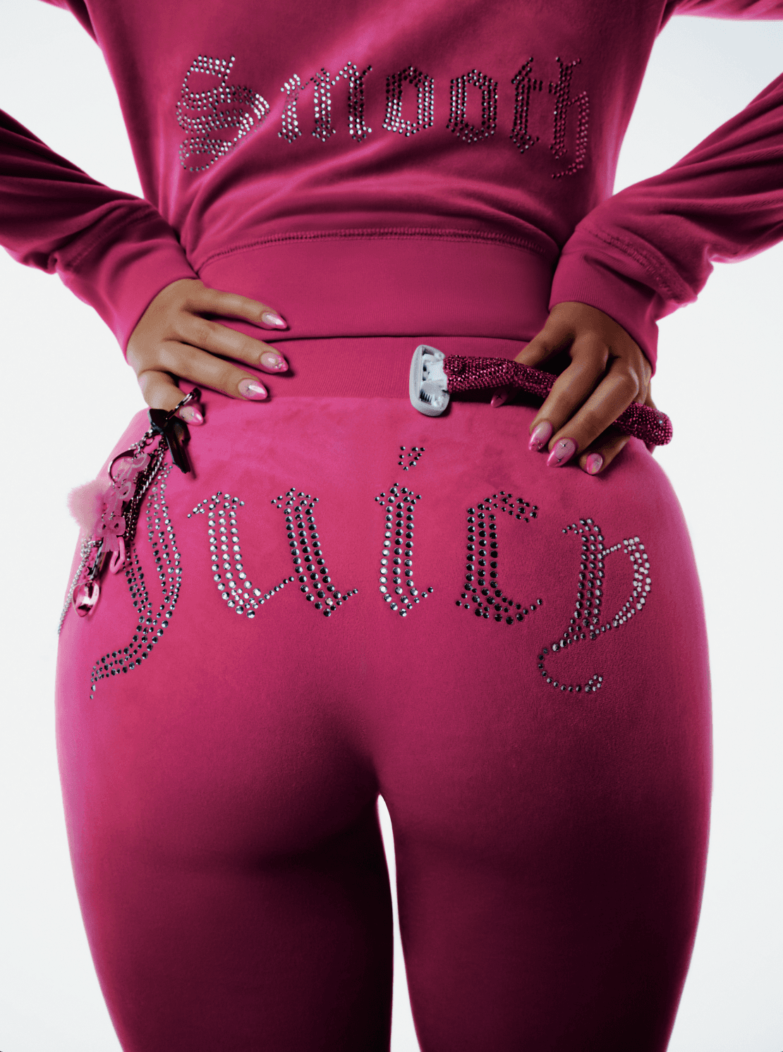 Custom collaboration elements were developed to extend the campaign beyond imagery. A custom hot-pink Juicy tracksuit anchored the visual world, while a custom bedazzled pouch was created as a gift-with-purchase, reinforcing the collectible nature of the launch.